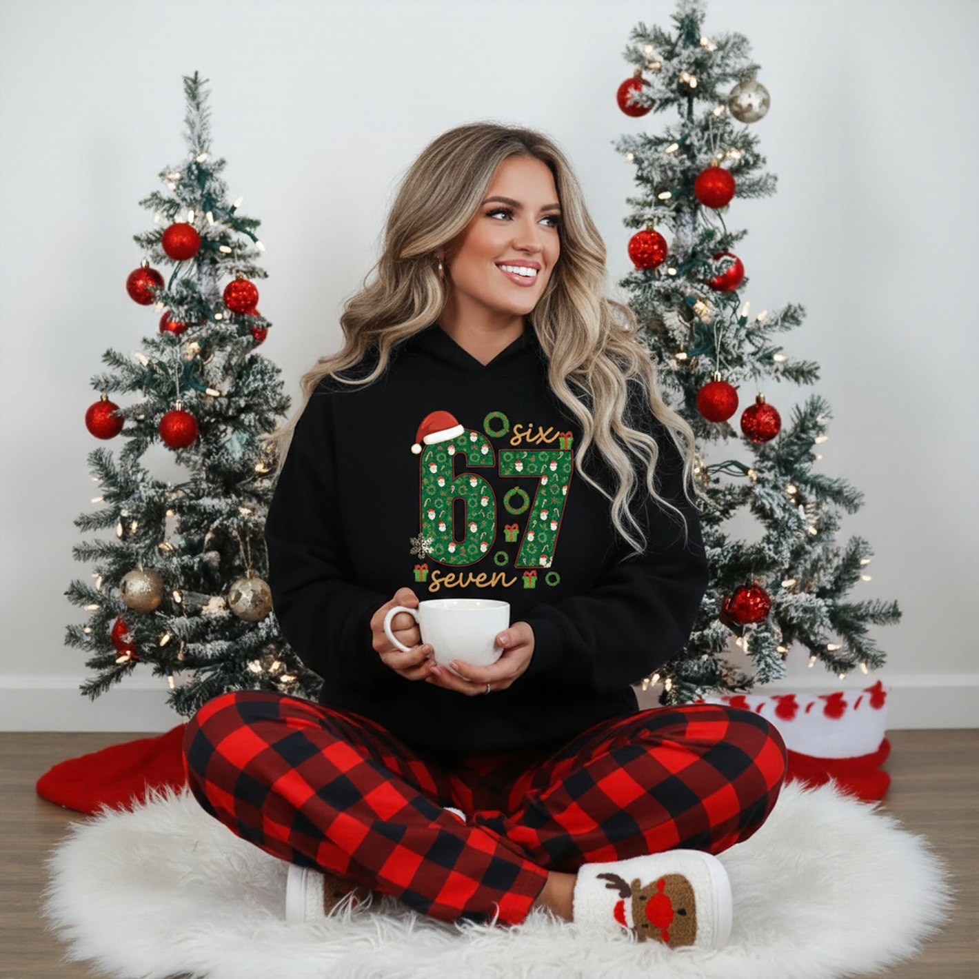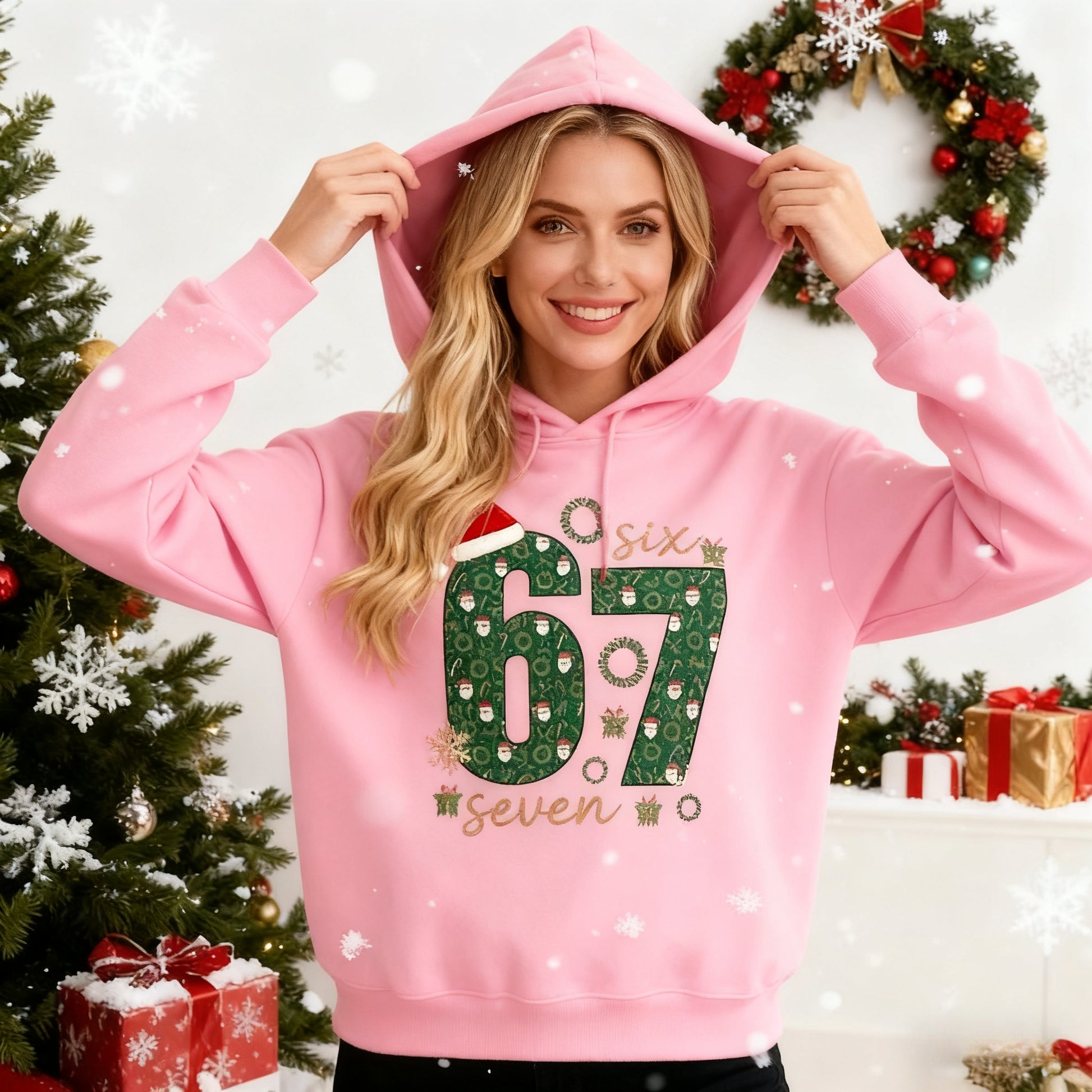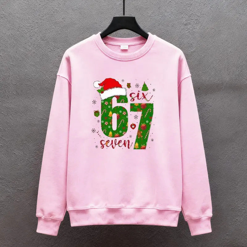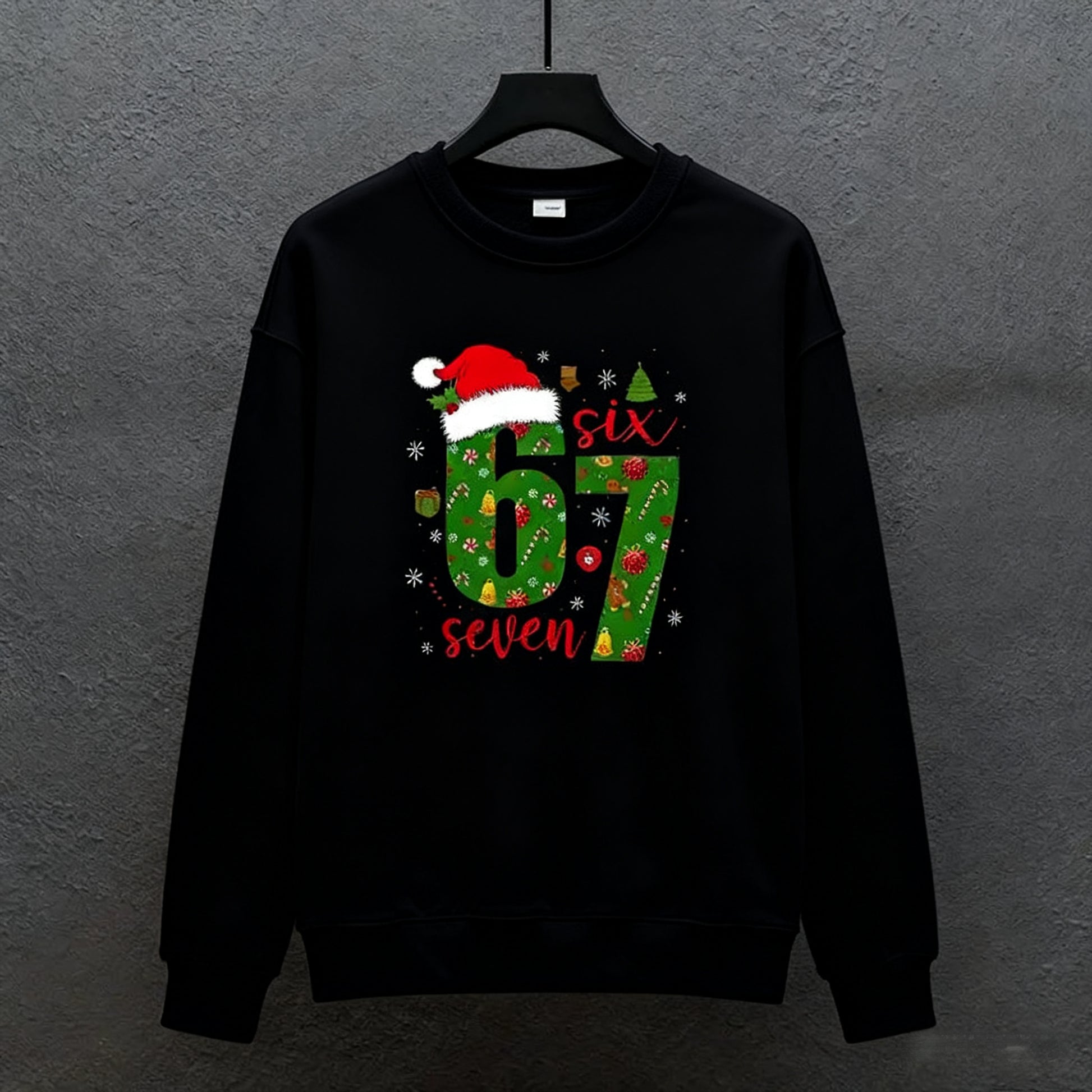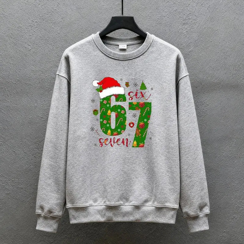 Inspired by the internet’s viral "67" trend, we’ve merged this playful meme culture staple with iconic Christmas magic. Imagine cozying up in a soft, warm sweatshirt adorned with Santa hats, twinkling snowflakes, and candy canes – all cleverly integrated with the legendary "67" design. It’s nostalgia meets holiday spirit, wrapped in one trendy package.