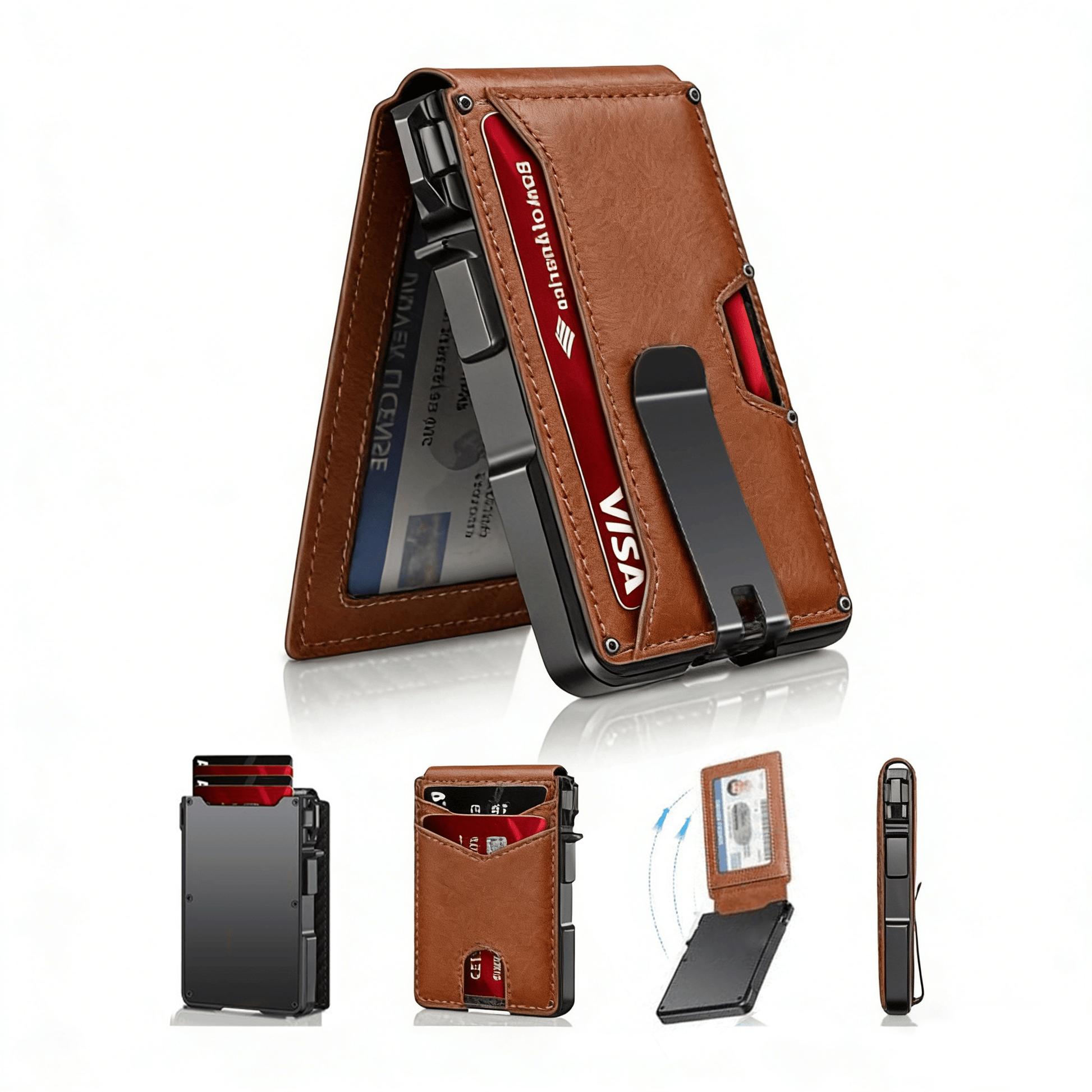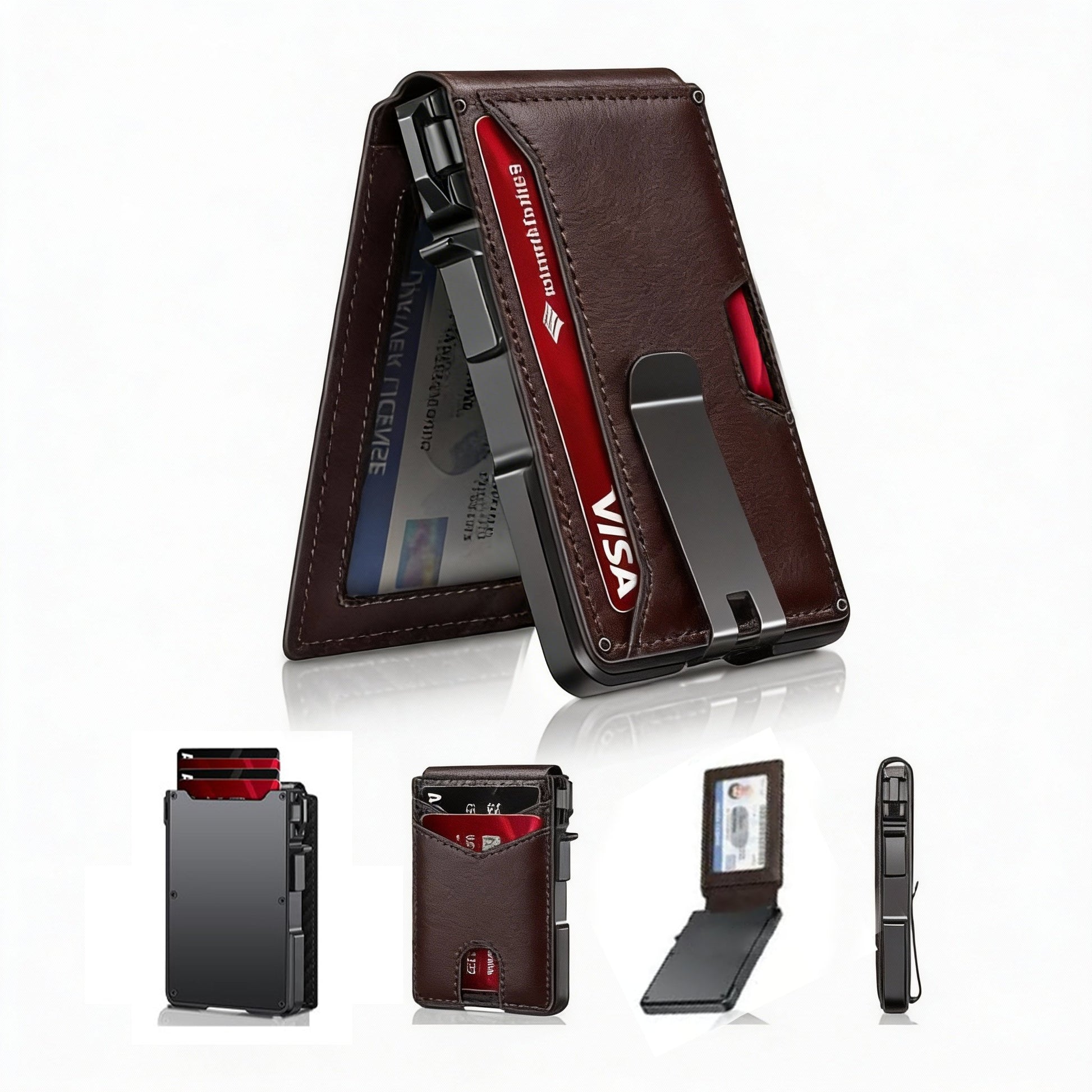 SLIM BODY, LARGE CAPACITY: This mens minimalist wallet holds up to 12+ cards. The aluminium chamber holds 6-8 and the leather flap holds 4-6 (1 ID window included). There are also removable money clips on the back capable of holding 5+ cash.