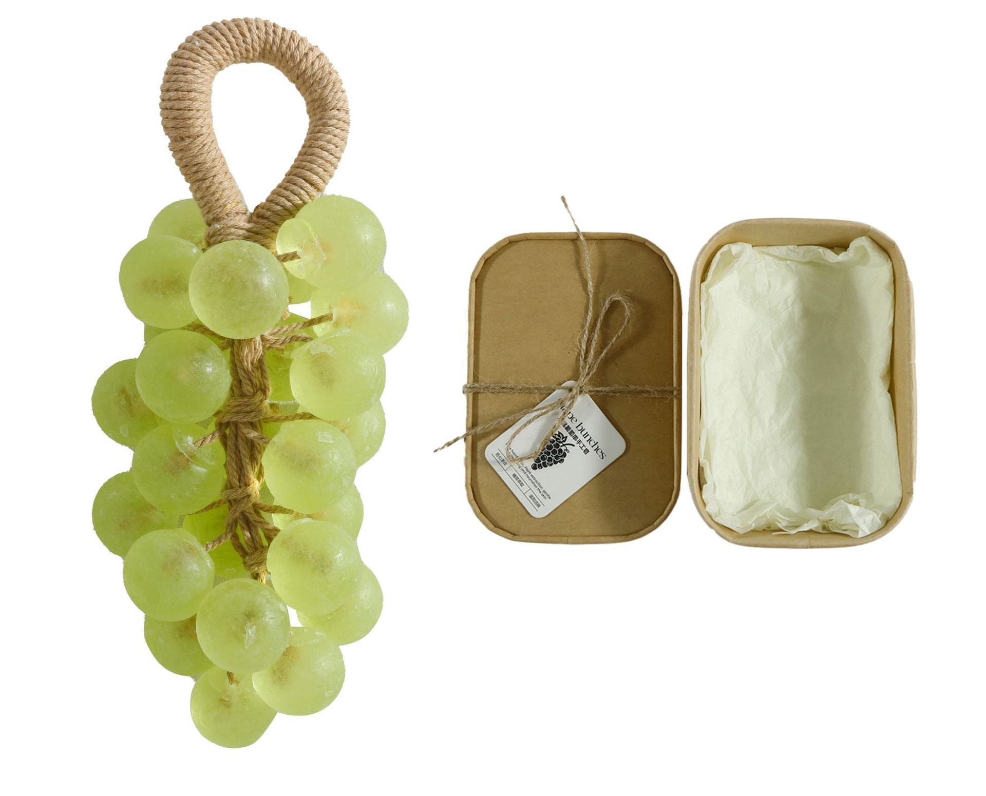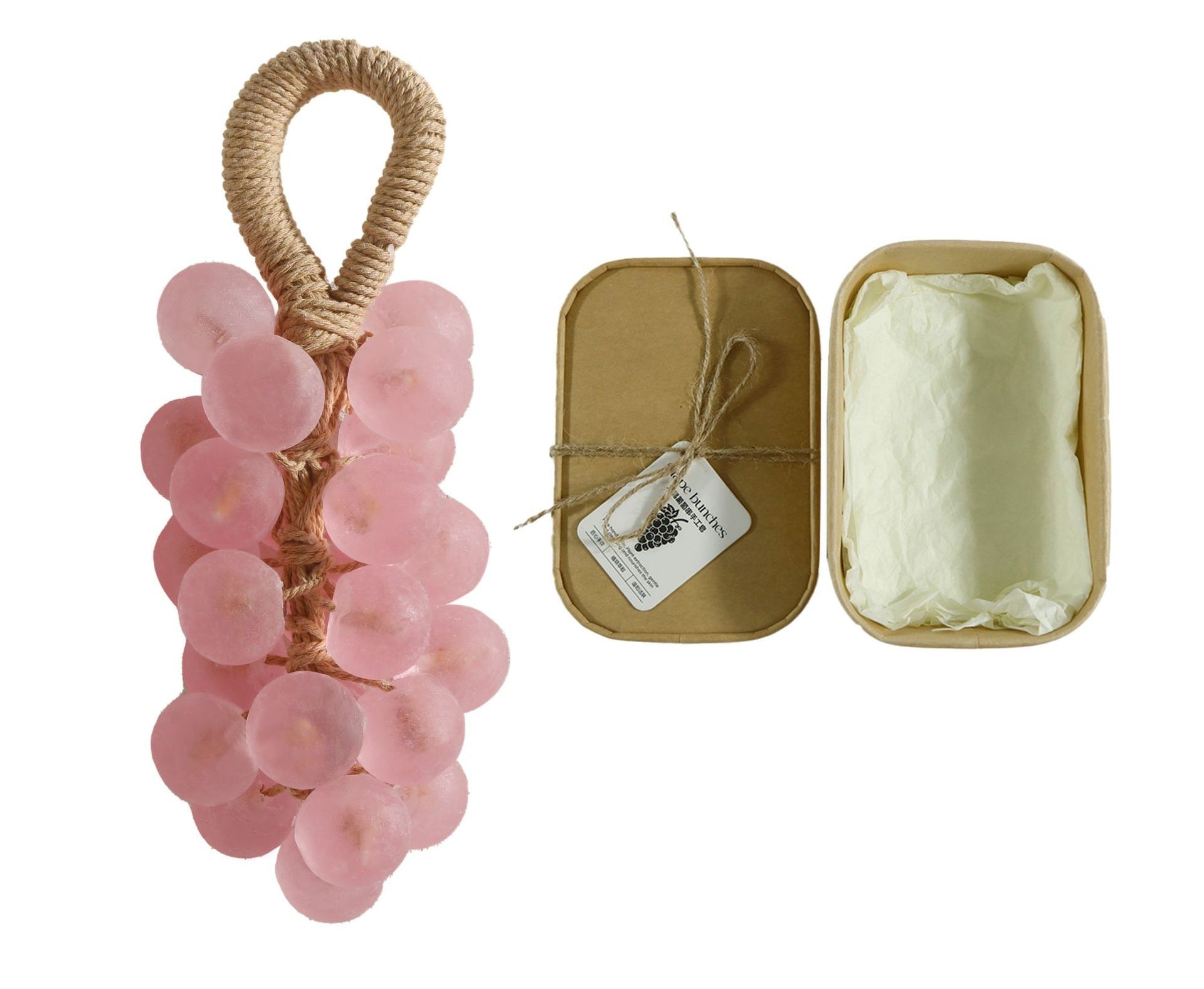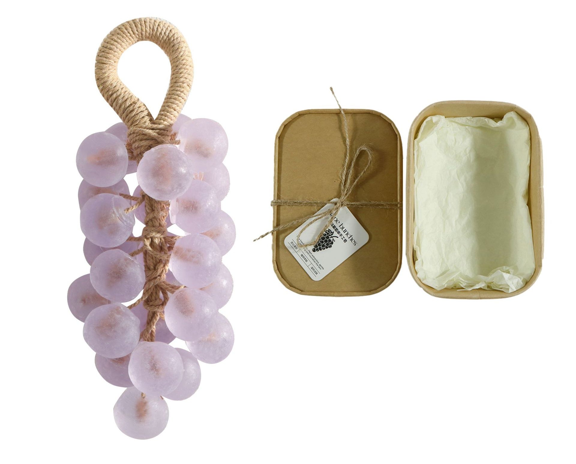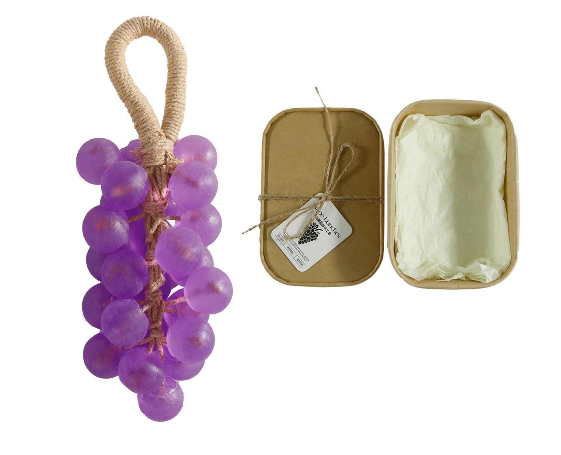 🌟Usage: Aesthetic & Gift-Ready · Comes with a box, ribbon, and bow. No extra wrapping needed!How to Use·Wet your hands or body.·Rub the grape soap until foam appears.·Rinse and enjoy soft, fresh skin.·Hang it up with the rope to keep it dry.